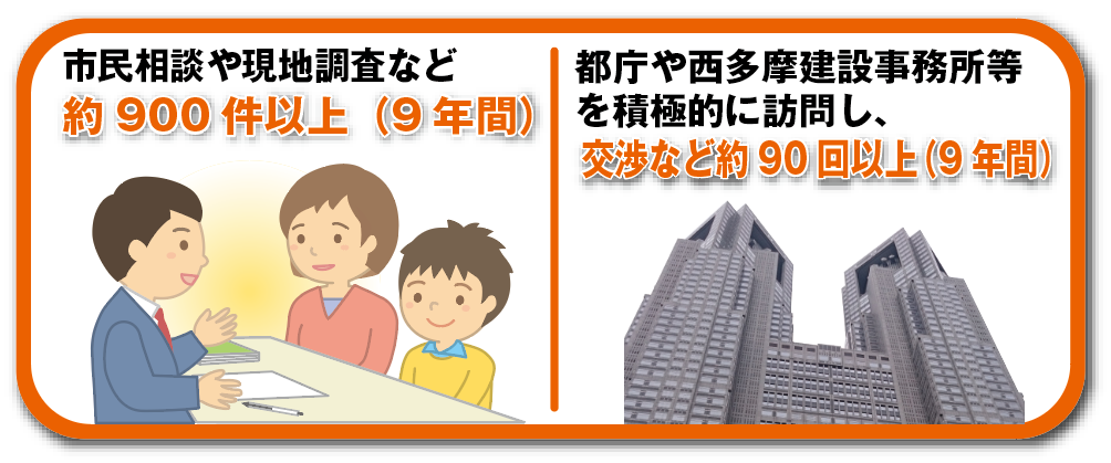 また、彼は、都職員としての経験とネットワークを活かして、市民の要望を実現するため、都庁や西多摩建設事務所等へ直接交渉に出向き、私たちの想像以上に迅速に成果を上げてきました。東京都との太いパイプがあることは、当市の発展・課題解決に大きな力になります。